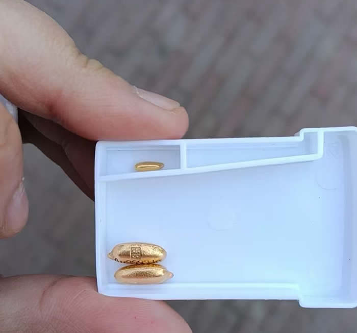 圖中較大顆為摻入的“假金米”,小一點的為真金米