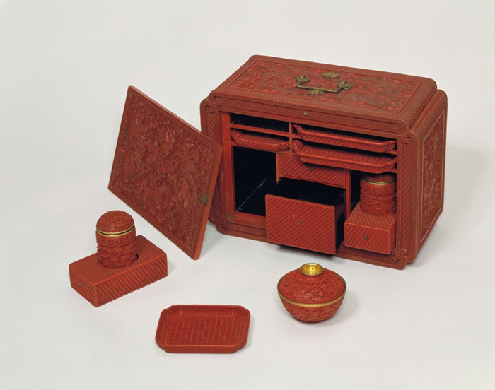 “海水龍珠紋提匣”以剔紅工藝制成,上雕云龍紋,內有大小不一的抽屜,用作盛裝茶壺、茶碗、茶葉罐、茶盤等。匣上有提梁,便于攜帶。設計造型既滿足飲食的流動性,也體現出士大夫的優雅姿態。