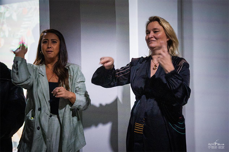 英國藝術家以及國際聾人及殘障藝術家團隊 Spectroscope 創始人 Cathy Mager 與上海藝術家胡曉姝 (Alice Hu)共同創作了這場沉浸式的視聽藝術作品,由三位杰出的中國聾人藝術家——胡曉姝、安迪與王先賀共同演繹,他們巧妙地將視覺白話(Visual Vernacular)和中國手語(CSL)與舞蹈的靈動相結合, 配合上海聾人畫家何力峰所繪制的視覺插圖,在光影交錯的流動畫面里,以地球面對氣候變化的挑戰為隱喻,展現了全球聾人群體的堅韌精神,暴風雨和凋零的花朵象征著聾人群體在世界各地面臨的包容性障礙, 而充滿鳥鳴與昆蟲嬉戲的豐饒景觀,則寓意著希望與未來的成長。當晚,一百位嘉賓蒞臨現場,與廣大公眾一同沉浸在這一視覺盛宴之中,共同感受作品的獨特魅力。