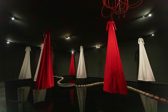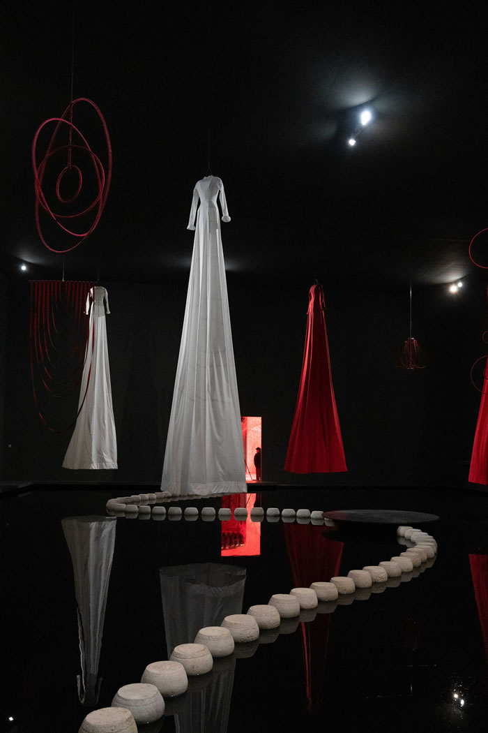 作品《多重現實》營造出極具張力的“劇場感”。在昏暗的展廳里,七件巨大而空蕩的衣裙緩緩旋轉,倒映在平靜而漆黑的水面上。在此,藝術家以空蕩的連衣裙為載體,既是對“第二層皮膚”的隱喻,亦是 對“肉身消逝后靈魂起舞”的追問——肉身雖消失,但仍能從裙擺的運動中感受到其曾經的存在。藝術家坦言:“衣服承載個體的記憶、情感與經歷,是自我的延伸?!薄笆挛锏娜毕⒎窍?,而是融入更遼闊的宇宙,重新參與時間的流轉,與萬物相連?!备╊_下,水面上一條蜿蜒的石墩小徑連通著兩個獨立的空間,一端經過黑暗的甬道通向柔光充盈的《意識的蛻變》,另一端則恍惚間暈染出一片紅色繩海,仿佛施了魔咒一樣“引誘”觀眾“通往靜寂之門”。