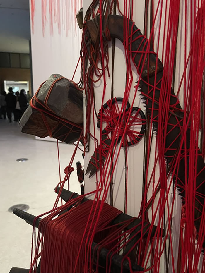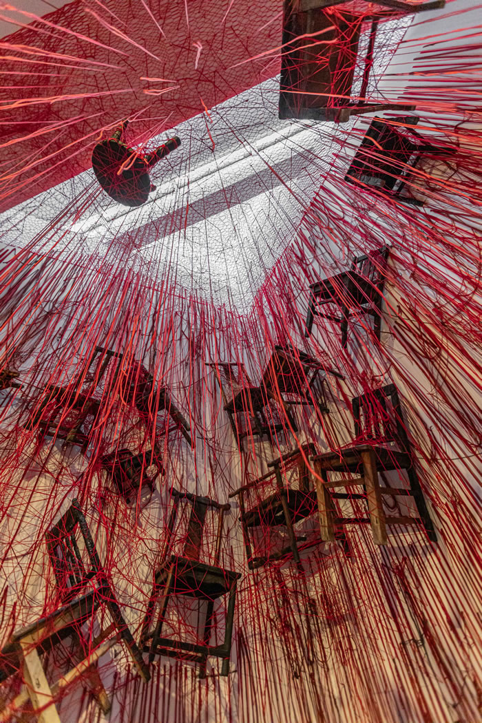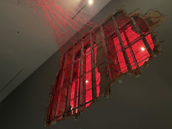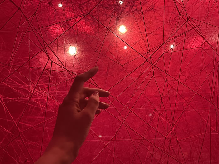 鹽田千春的紅繩,如同人體內的一條條毛細血管,蔓延交錯,細密著將整個展廳染出一片紅光。當這些紅繩纏繞著奪墻而出時,又像極了人性本身——伸張向渴望的宇宙,全力沖破邊界又在這一過程中彼此交織而束縛。