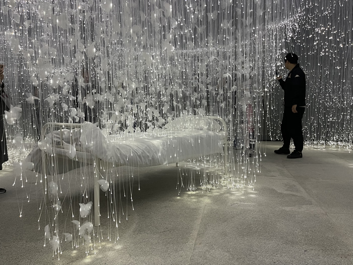 《意識的蛻變》呼應著“莊周夢蝶”的哲思。通過懸瓜的蝶翼與殘留體溫的床鋪,挑戰“肉身-意識”的二元對立。藝術家坦言:“每一次入睡都是死亡的預演——一次超越身體的旅程?!痹谶@里,“空”恰似生死界限的消融。而在這一片如夢似幻的晶瑩天地間,夢蝶-化蝶,是否也為每位觀者在美好卻脆弱的幻象中營造出一次“意識蛻變”的內觀契機呢?