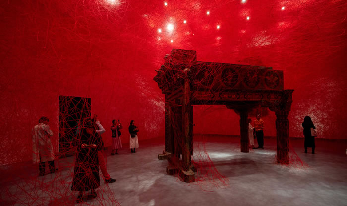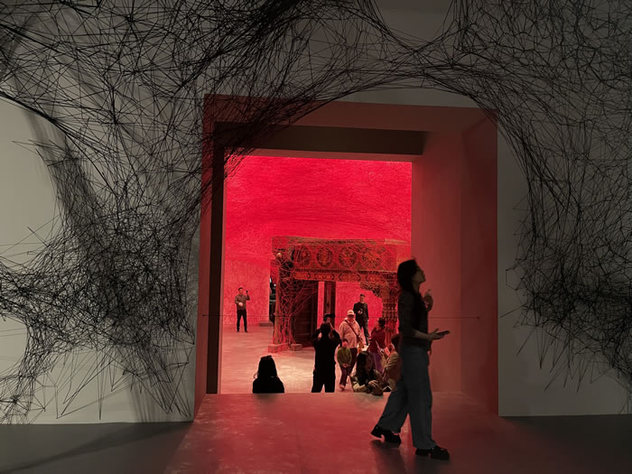 《通往靜寂之門》以藏傳佛教古建門庭為核心,數萬根紅線刺穿墻體延伸天際,形成物理空間與精神維度的雙重突破。當觀者穿越這座"門庭"時,傳統古建的構件與當代裝置語言碰撞出東方"空"的時空觀——存在即是在穿透與彌合中永恒流動。本次展覽策展人閆士杰認為:“鹽田千春的紅線在此是依緣而顯、隨緣應物的當下覺知?!倍@件作品也邀請觀者進入一個沉思與悟化的空間,凝視與自渡。