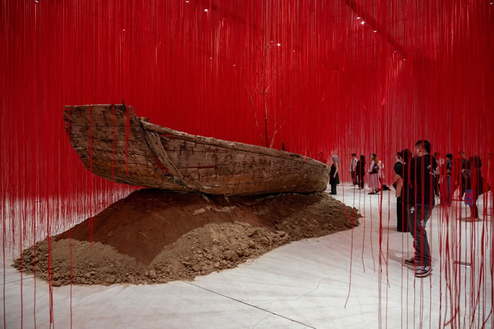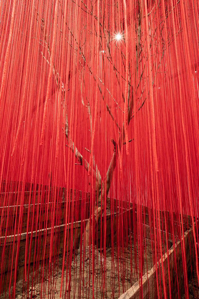 《生根的記憶》中,一艘來自河北邢臺朱莊水庫的廢棄木船占據核心空間,船體裂縫中生長出一棵樹,紅色繩索如雨絲般垂落,滋養根系。鹽田千春通過“樹從船中生”的意象,構建自然與人類活動的共生循環:樹是船的起源,船又是樹的搖籃,孕育出新的生命——物質的消亡恰是生命輪回的起點,亙古綿長中,此消彼長的循環轉換將無數個短暫的瞬間鏈接成了永恒。