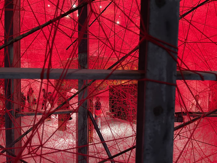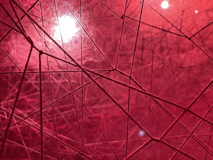紅色線繩如同毛細血管一樣交織成一片海,在燈光下彌散出紅色的氤氳光芒(拍攝:傅朗)