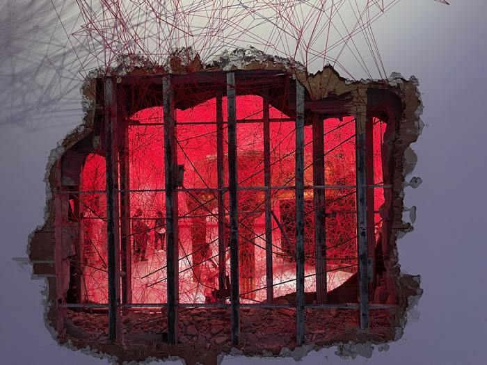 紅繩破墻而過,蔓延出展廳的既定空間(拍攝:傅朗)