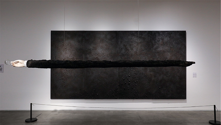 梅法釵,《燼》系列5,皮紙、碳渣、膠240×480cm,2024?梅法釵工作室,布里詩畫廊