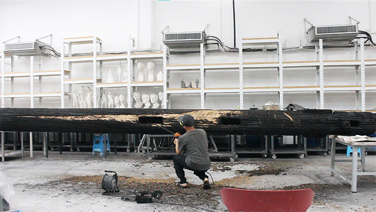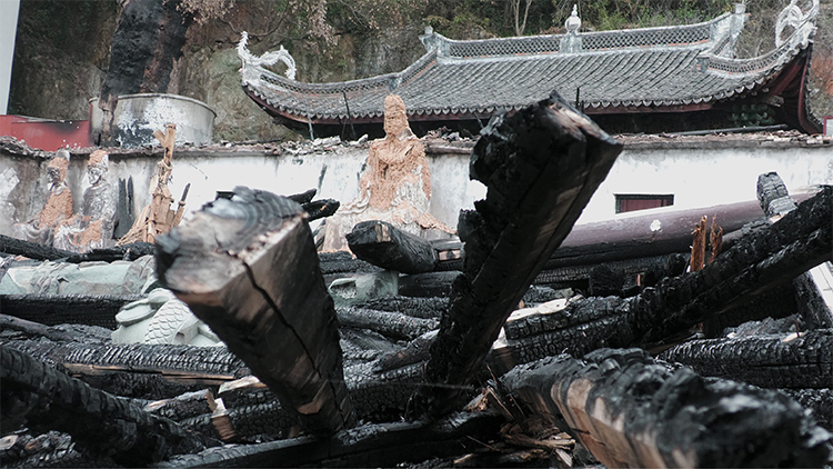 藝術家梅法釵近年的創作是從“焦炭”的物質媒介給予利用、轉化和展開的。2017年,他回到故鄉照顧生病的母親,親情的難以割舍和內心的焦慮,間或于些許的鄉愁,磐恒于他人生的特殊經過。2021年,他家鄉一座建于清代的城隍廟在一次大火中化為廢墟。作為傳統的民間宗教文化中崇祀的重要神祇之一,并維系社群的城隍廟瞬間變為斷壁殘垣,也就成為他對母親、對故鄉眷戀情結的最后挽歌。