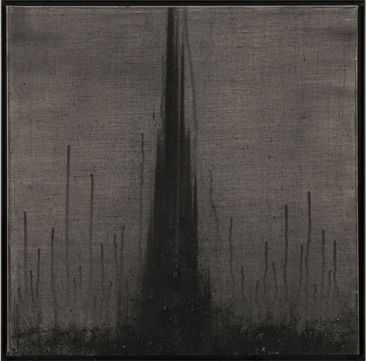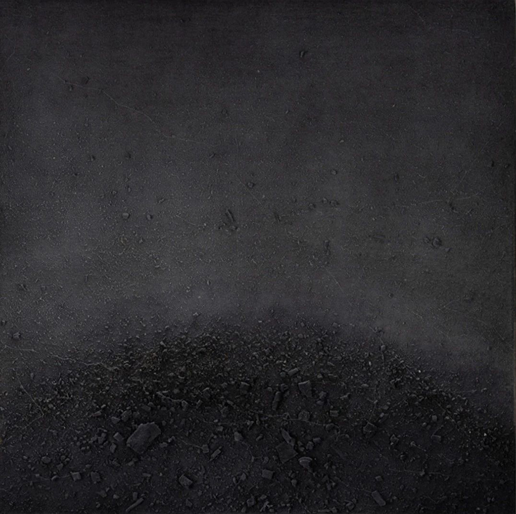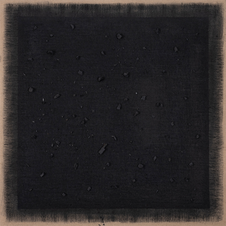 梅法釵,《燼》系列17,亞麻布、炭渣、膠100×100cm,2024?梅法釵工作室,布里詩畫廊