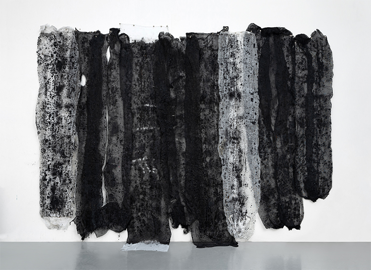 梅法釵,《燼》系列1,布、木炭、膠、丙烯500×370cm,2025?梅法釵工作室,布里詩畫廊
