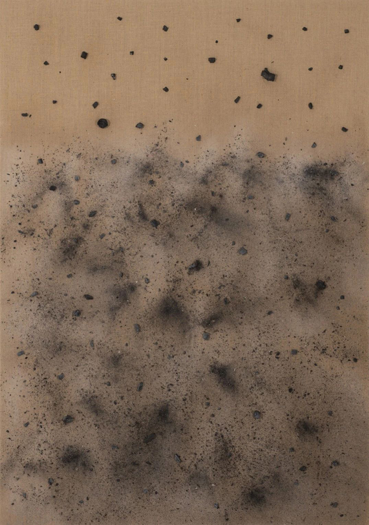 梅法釵,《燼》系列8,亞麻布、炭渣、膠、丙烯200×140cm,2024?梅法釵工作室,布里詩畫廊
