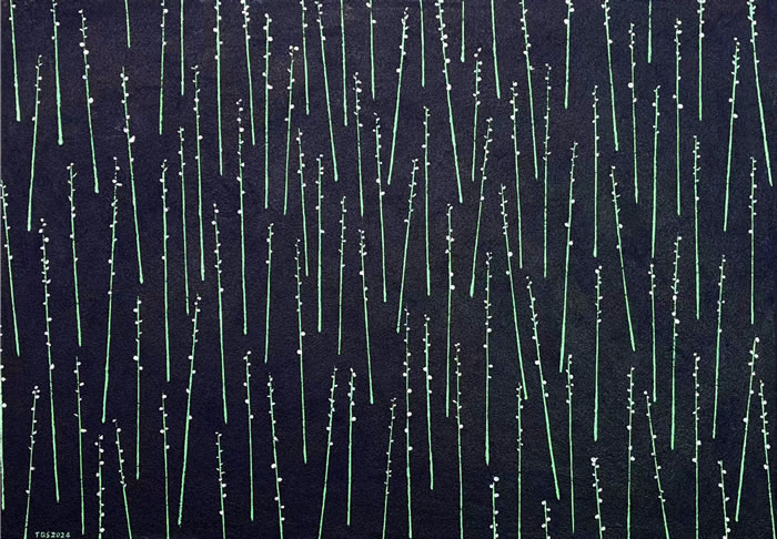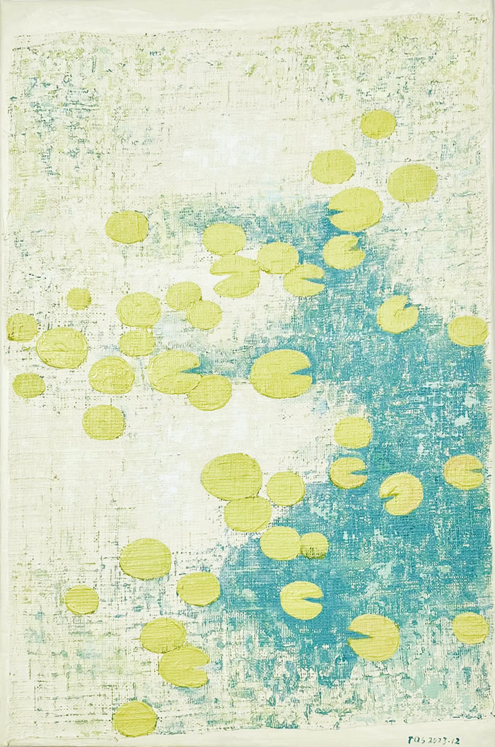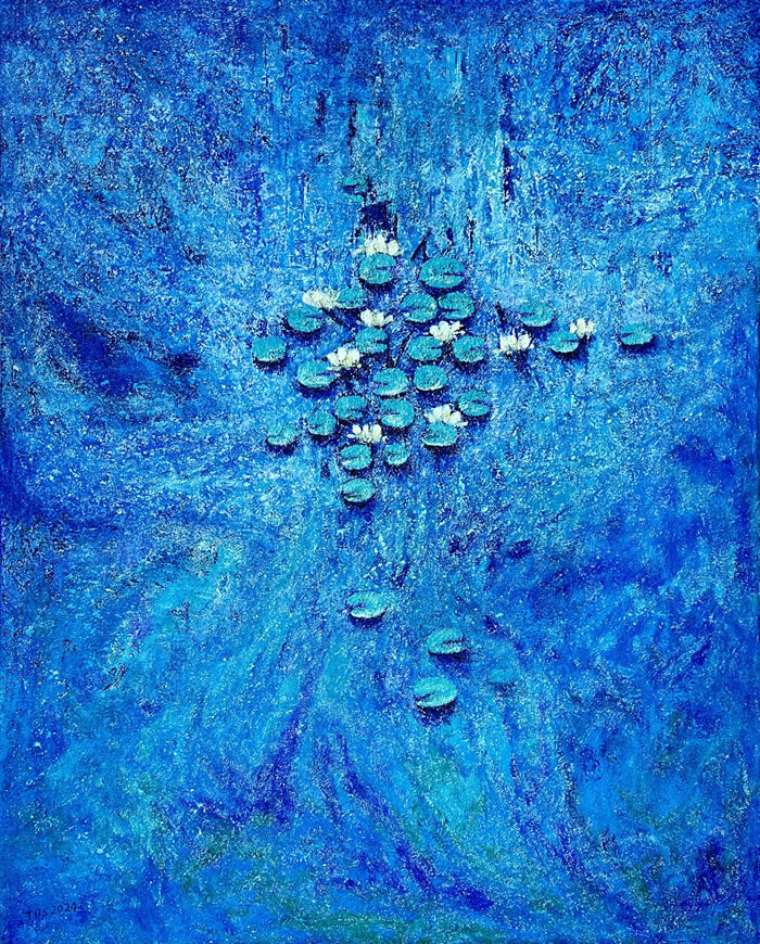 睡蓮這一題材被印象派畫家莫奈畫過以后,已經鮮有藝術家嘗試,他人很難畫出新意。唐岐山的《睡蓮》系列作品,大膽追求對傳統創作范式的突破。創作初始,他秉持極簡主義理念,力求以簡潔的線條和筆觸勾勒形象,摒棄繁雜的元素,使畫面呈現清新單純的視覺效果。繼而,他巧妙地引入中國畫的留白技法,使作品瞬間增添了靈動、悠遠的氣韻。蓮葉、水草與浮萍的布局疏密有致,錯落得當,留白之處恰似開啟了一扇通往無限遐想的窗扉,整幅畫作由此彌漫著空靈靜謐的詩意氛圍。畫面的核心元素——蓮葉,被簡化為具有獨特表意功能的符號,具有強烈的視覺辨識度。畫家還融入了西方構成理念,打破了傳統二維畫面的扁平局限,通過巧妙的布局與設計,賦予畫面以豐富的立體感與層次感,拓展了畫面的空間維度與視覺張力。為了避免極簡風格陷入單調與平庸的泥沼,他特意選用麻布與石英砂作為畫面的創作材質,通過摩挲與處理,營造出細膩而獨特的肌理質感。這一系列作品盡管融合了西方藝術元素,但作品深處依然流淌著中國傳統文化的精神血脈,中西兩種藝術元素非但未產生沖突,反而相互交融、彼此輝映,實現了和諧共生的藝術境界。中國傳統藝術的空靈意境與西方藝術的結構張力相得益彰,兼顧了簡約與豐盈的雙重審美特質。