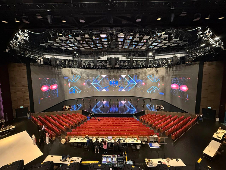 《澳門2049》的籌備過程中,聲音設計經歷了多輪調整。最初團隊計劃使用劇場原有的雙聲道(立體聲)擴聲系統,2023年12月金少剛根據劇場和節目需求,向導演組提出改用環繞聲的混音方式并被采納。2024年8月整臺演出在北京懷柔影視基地進行了1:1彩排,團隊對音場效果進行了多次調整,同期出品人何超瓊女士以其卓越的藝術眼光和對中華文化國際傳播的戰略考量,決定升級至L-ISA沉浸式音響系統。這一決策彰顯了主創團隊對聲音品質的不妥協態度,也為整個演出奠定了世界級的聲學基礎。