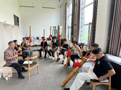 《澳門2049》中《苗歌·空靈》單元,音樂總監吳彤(左一)帶領演員進行排練
