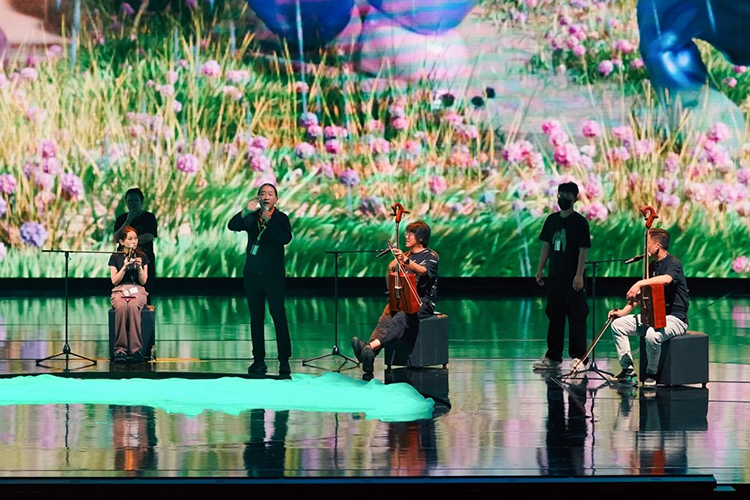 《呼麥·飄渺》節目中,呼麥表演者之一——演員蒙根感嘆道:“舞臺上的紗在空中飄動,就像我們蒙古人的哈達在禮敬天地!”這一視覺意象與音響設計相得益彰,共同編織出一幅聲畫交融的草原畫卷。