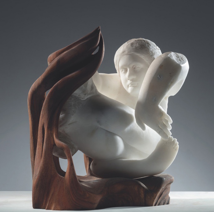 展覽對材料的選擇具有雙重象征意義。香港的再生木材源自1918年臺風后城市清理的殘存樹木,其紋理中凝結著自然災害的創傷記憶與生態再生的時間痕跡;意大利卡拉拉大理石則承載著文藝復興以來的古典美學傳統,象征著歐洲藝術的崇高性與永恒性。這兩種材料原本分屬不同的文化符號系統:一方是東亞現代城市中自然與文明的沖突見證,另一方是西方藝術史的經典介質。 然而,在《Fusion》的創作框架下,材料的文化屬性被刻意懸置。策展人CynthiaSah與NicolasBertoux強調:“我們并不試圖展現東西方差異,而是讓材料成為中立的創作媒介?!边@種去符號化策略在藝術家的實踐中得到充分體現。例如,在Francesca Bernardini的大理石雕塑與Danny Lee的木質山云之間,一場關于永恒與無常、實體與虛空的東方美學對話悄然展開。Danny以斧鑿之力將堅硬木材化為流動的云絮,其作品《山與流云Mountain and Streams》以嶙峋陡峭的山形扎根大地,而木質云朵卻以近乎失重的姿態懸浮于側——這組矛盾體的并置,暗合道家“負陰抱陽”的哲學:山體如《道德經》中“大制不割”的坤德,云絮則似“飄風不終朝”的易變之境。材料的物性在此被賦予形而上的張力,木質云朵的年輪肌理隨光線流轉,仿佛將時間坍縮為可視的呼吸。