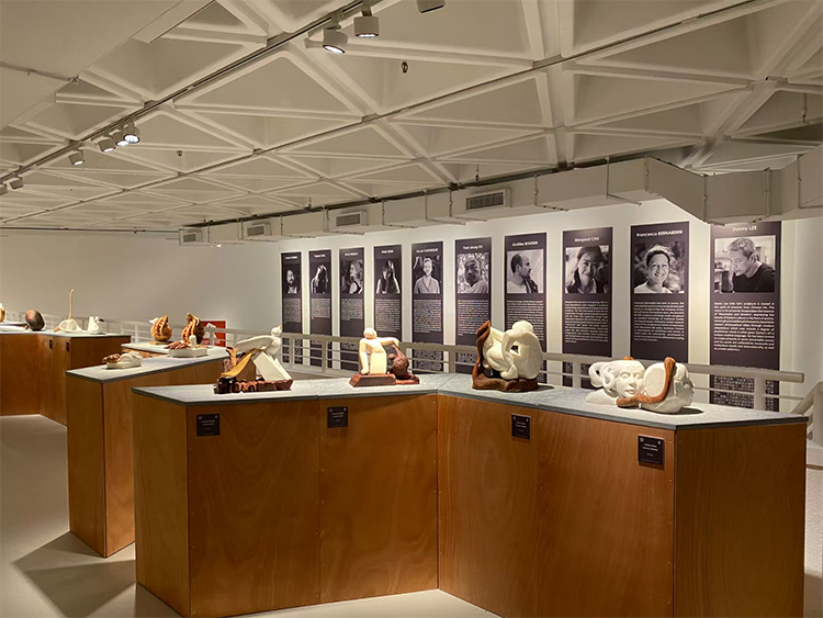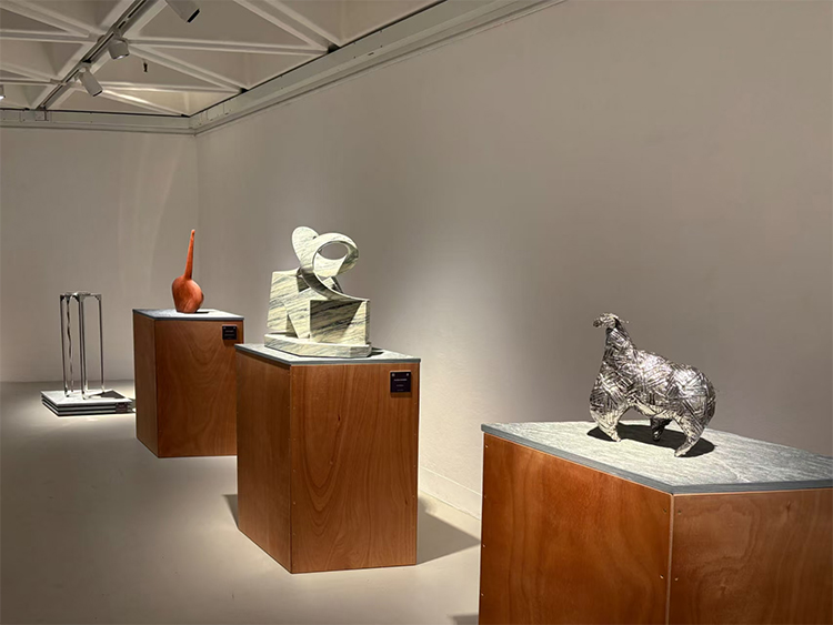 Flavia Robalo的大理石水痕與Violet Shum的木質漂流殼,在展場中交織成一部關于遷徙的液態史詩。FlaviaRobalo以意大利卡拉拉石的冷冽雕琢——少女俯身掬水的瞬間被凝固為永恒的儀式,水流從她指縫滲入石紋,仿佛將地中海的鹽分注入東方水墨的留白。而Violet Shum的木質裝置《When we met》則以螺的拓撲學重構故土:那些起伏如四拍子節奏的曲面,既是潮汐沖刷的數學顯影,亦是香港離散者精神圖譜的物化。當大理石中的“水”與木質“殼”在空間中并置,材料的對抗性悄然消解——水的重力被殼的浮力中和,恰似流散者以輕盈姿態承載鄉愁的重量。
