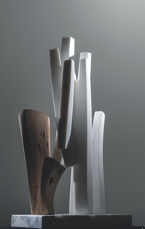 二人的創作軌跡形成螺旋上升的互文:DannyLee以云破山,FrancescaBernardini以山納云;前者將東方水墨的“留白”轉化為三維空間的氣韻流動,后者則將西方雕塑的體積感解構為東方賞石的“透漏”美學。在展覽的框架下,這種對話超越了簡單的文化符號拼貼——當FrancescaBernardini追索DannyLee雕塑中的線性節奏時,她并非在復刻東方性,而是以大理石的永恒性重述“無?!钡拿};而他們構筑的石質窗欞間植入木構元素,實則是以材料的易朽性叩問存在的本質。木材與大理石的碰撞既非東方主義的異域想象,亦非西方中心的技術崇拜,而是通過物質的重構,創造出一個超越二元對立的混合美學空間。