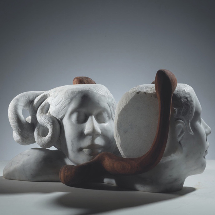 《FUSION》項目的起源可追溯至2019年香港與意大利領事館的文化交流計劃。彼時,策展人CythiaSah和NicolasBertoux(Arkad基金會創始人以及藝術家夫婦)試圖通過兩地藝術家駐地創作,實現自然材料(香港臺風后的再生木材與意大利卡拉拉白色大理石)的對話。最初的構想很簡單:香港藝術家赴意大利雕刻大理石,意大利藝術家來香港創作木雕。然而,新冠疫情的全球蔓延迫使原定的人員流動計劃擱淺。策展人CythiaSah和NicolasBertoux面對物理空間的隔絕,他們并未選擇放棄,而是將危機轉化為契機,重新設計了一種「遠程合作」模式:“既然藝術家們無法見面,就讓他們的作品先“握手”吧?!啊獌傻厮囆g家分別以本土材料創作雕塑,隨后將作品交換,由對方藝術家進行二次改造。這種「材料-作品-再創作」的鏈式反應,成為展覽的核心方法論。于是,10位藝術家(5組搭檔)在互不相識的情況下,各自用本土材料完成一件作品,再寄給對方任意改造。規則只有兩條:1. 可以切割、疊加、重組,但不能徹底毀滅原作;2. 不提前溝通,全憑藝術家的直覺進行相應。