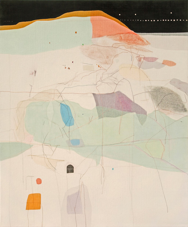 本次展覽題目“光天化日”指向的是藝術家對一種無遮蔽的、直白的自然現實的客觀認識。田召亭通過紗布的透明性和顏色的視覺層疊,營造一種“暴露與遮蔽”的辯證關系,同時,“化日”則跟藝術家畫面中新出現的用針線縫制的線條和形象直接相關。藝術家一直在為自己想不清楚的情愫尋找出口,而《山海經》中一些有“異界性”的形象吸引了他的注意,這些形象極大地釋放了藝術家的緊張感,為他所有不合邏輯的浮想找到了連接點。這種感覺就好像:我們正午站在戶外,山、水和城市環繞周圍,抬頭看一眼太陽,那種強光的刺射讓存在感無處遁形,同時也讓個人的私密性展露無疑。而田召亭的創作,正是為了維護作為個人的生存感,所進行的異界化的逃遁。