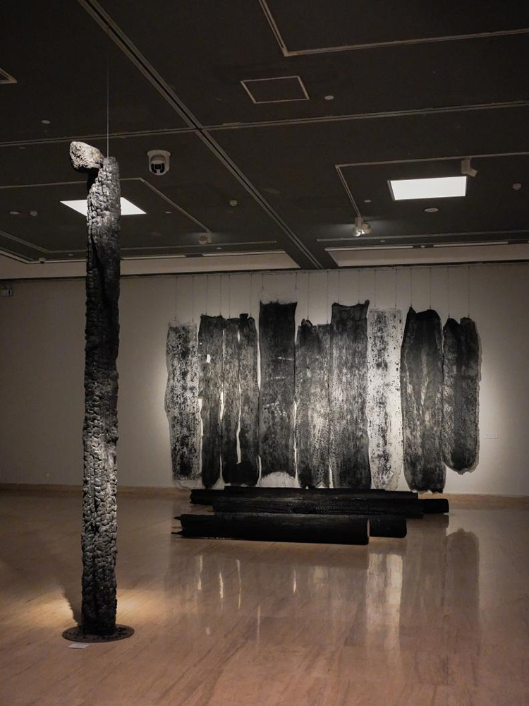 其作品兼具了現代性創傷的文化療愈。城隍廟作為民間信仰的載體,其毀滅象征傳統文化在現代化進程中的邊緣化。梅法釵通過焦木的再創作,將廢墟轉化為“文化考古”的現場,如《燼·系列1》以布面拼貼炭木碎片,形成歷史檔案般的視覺結構。這種創作方式與德國藝術家安塞姆·基弗(Anselm Kiefer)對戰爭廢墟的反思異曲同工,但梅法釵更強調本土文化基因的延續性,試圖在物質廢墟中重建精神家園。梅法釵的焦炭承載著具體的地方文化記憶,具有敘事性與象征性,以及“物與空間”的關系。