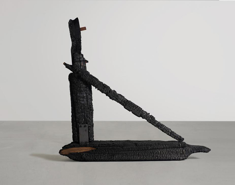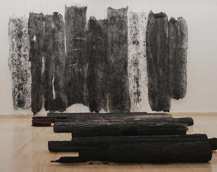 藝術家梅法釵早期作品從尋覓一件廢棄了的干枯木頭開始,經過斧劈打磨,把自己的情感融入斧劈與刀痕之中,或抽離概括造型,或粗糙表象古樸精神內核向內關照,呈現生命的誕生、毀滅、超越而涅槃重生。形成作品的敘事與抽象的詩意。近期梅法釵的由文化記憶與生命經歷,重在個體對社會及其眾生的敏銳性表達。這些作品采用他老家臺州一座遭受火災而倒塌的城隍廟古建筑的廢墟,炭黑的焦木構成的場域深含歷史哲思與人文關懷,述說著人文的脆弱,參透寂滅的意蘊。從而平靜、緊張、焦慮等等共同成為藝術家復雜的生命狀態,也是藝術家創造性的的成果。因其脫離、超越了西方抽象藝術的形式主義。燃燒后的焦炭、沙石、墨色形成打破理性原則,注入偶然的、激情的,以及情感的要素。構成作品與宏觀的歷史縱深,以及與不斷變幻的現實之間混雜關系。