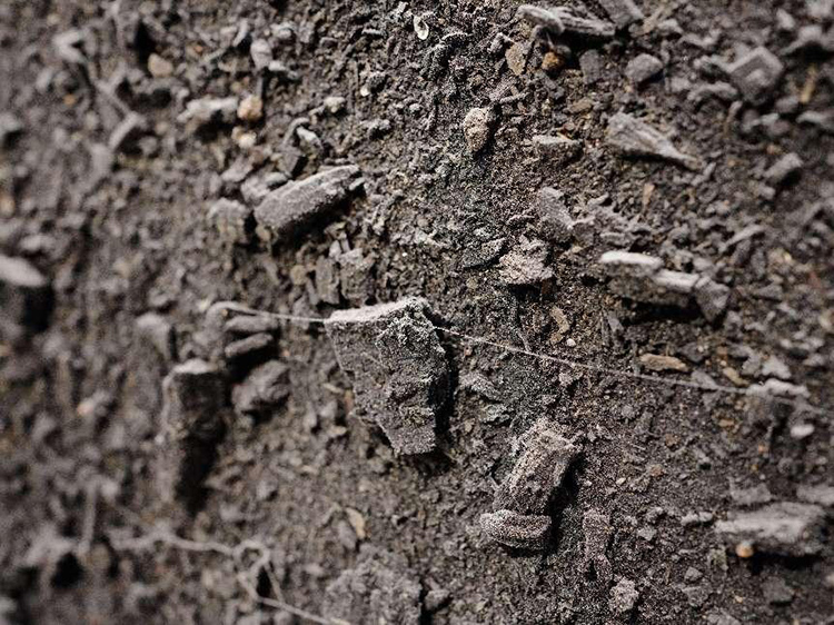 梅法釵,《燼》系列18,2024,亞麻布、炭渣、膠,100×100cm? 梅法釵工作室,布里詩畫廊