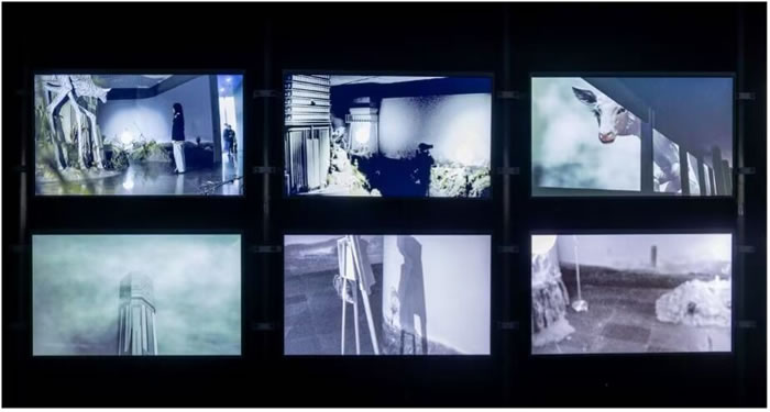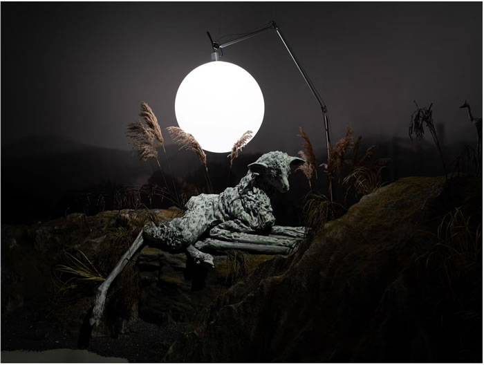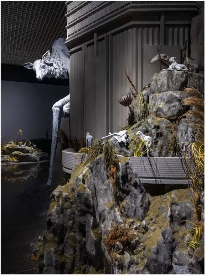 藝術家在理解威尼斯雙年展“處處是外人”這個主題的同時,將之與伊塔洛·卡爾維諾的虛構城市概念疊加、交錯,并調動多種媒介手段編織出的裝置。光線、機械和虛擬手段并置,放大的動物型體在建筑和荒原里彰顯出突兀,后半段空間將動物微縮,與前半部分構成矛盾,蘊育出的模糊、憂傷末日景象,透過身份錯位與空間異化促使觀眾獲對當代社會的末日焦慮有充足的體驗。