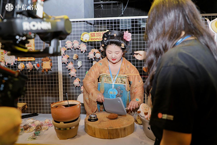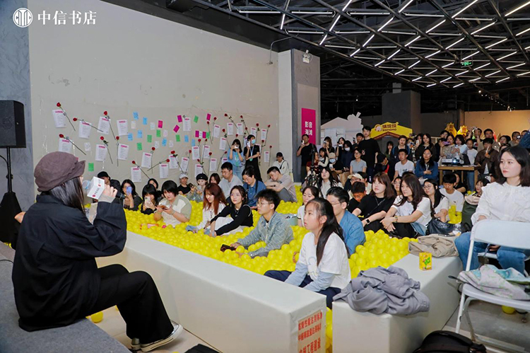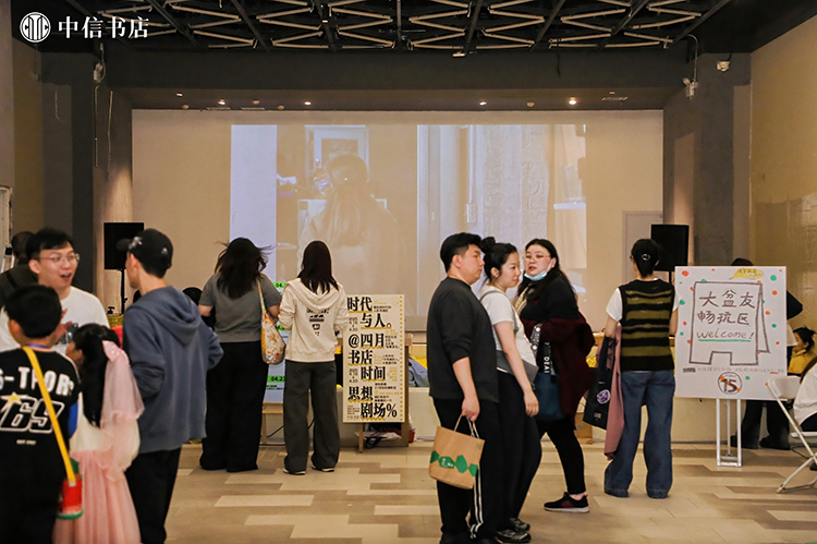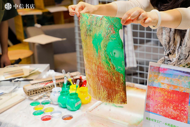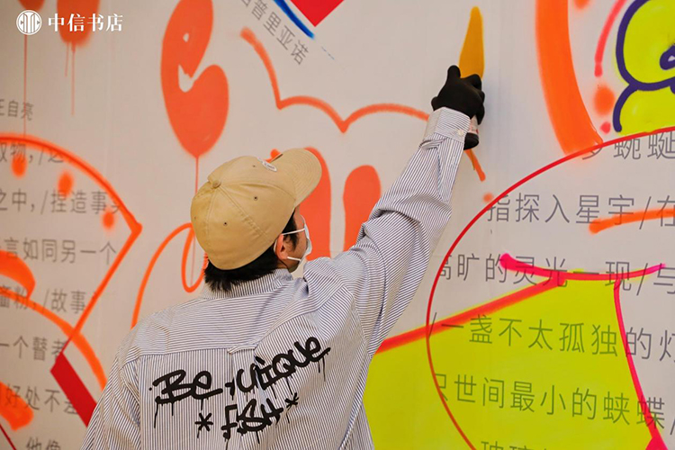 在市集舉辦期間,20余場文化活動在此開展,致力于以“閱讀”為載體的生活方式探索。中信書店聯合跳海、播客公社、浪影像等文化機構,帶來了“別問意義,先讓浪漫發生”的音樂讀詩會、播客閱讀開放麥、游戲快閃、電影展映及影評人映后談、劇本圍讀等閱讀社交活動。除此之外,書店邀請獨立藝術家,呈現獨特的視覺體驗,來自意大利的水拓畫工藝,讓每一位買書的讀者擁有一次“刷邊”體驗;涂鴉藝術家現場創作,在熒光色噴漆的揮舞下,圖案與文字交織成一面藝術打卡墻。讀者在這里不再是單一的市集“參與”者,而成為與書店共創“閱讀之城”的朋友。