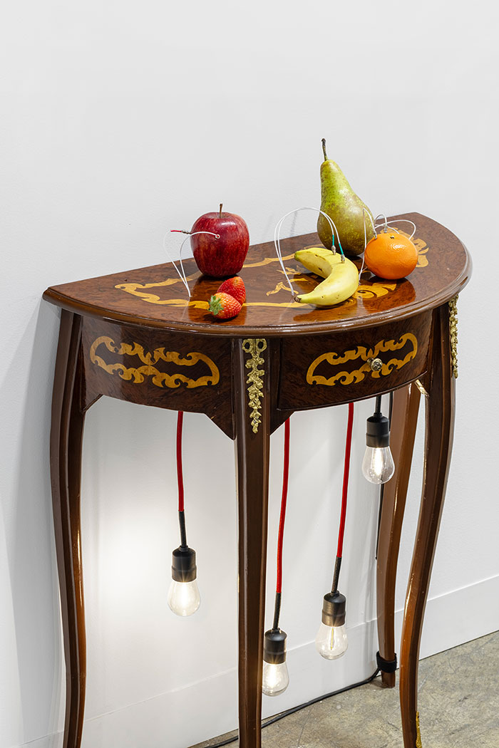 毛利悠子,分解,2025,邊桌,由水果供電的LED燈,57×53×70(h)cm?藝術家和空白空間