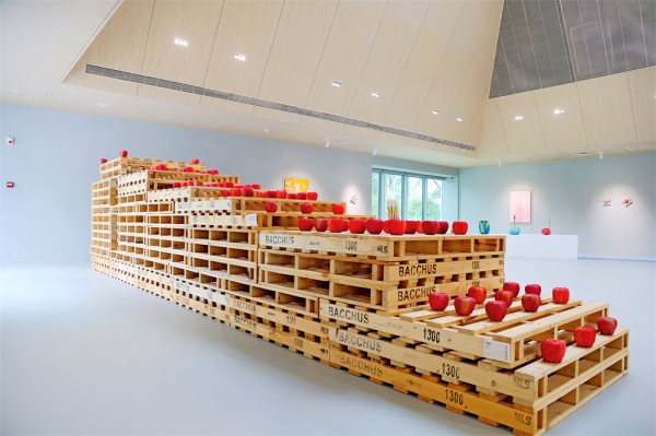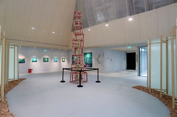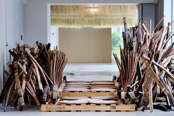 使用崍州蒸餾廠威士忌木桶蓋及廢拼板搭建的木橋所連接的兩個展廳