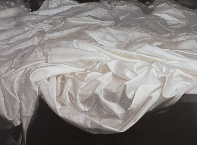 “我習慣收集生活中的微小‘刺激’,它來自我們‘瞬間印象’引導下的閾下知覺,可感受的最小刺激量。它或是一個具體的物、文字或是一個場景。這些偶然的細節會突然出現在特定的時刻,與特殊的情感記憶縱橫交織,這些局部成為我推進整個畫面的開始。這些‘瞬間’形成延展出一個知覺跨度,在跨度中間接記憶與期望敘事存在于同一空間,不同表層,其中我試圖在繪畫中創作中加入日記一般的私密情感的痕跡,成為更加私人化的表達,在畫面中完成最后故事的構想?!?/p>