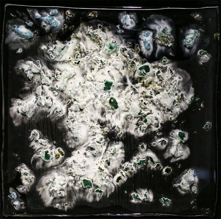 周知遠 Zhou Zhiyuan 20250425 青霉菌,自制瓊脂培養基,自制Ph值試劑,環氧樹脂 Penicillium, Agar Medium, Ph test strips, Epoxy Resin 46 × 46 × 5cm 2025