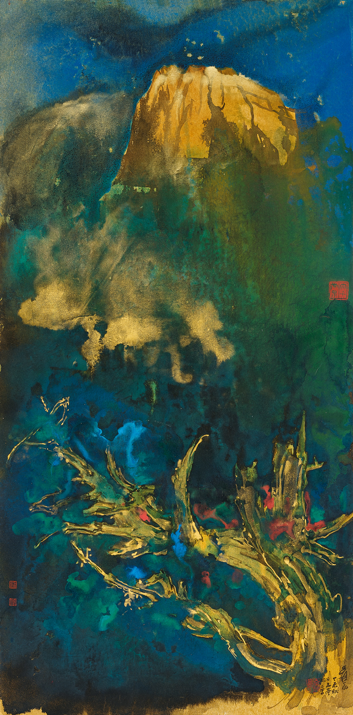Lot 3134 張大千(1899~1983) 日蝕,鏡心 潑彩金板,丁未(1967年)作,127.5×63 cm