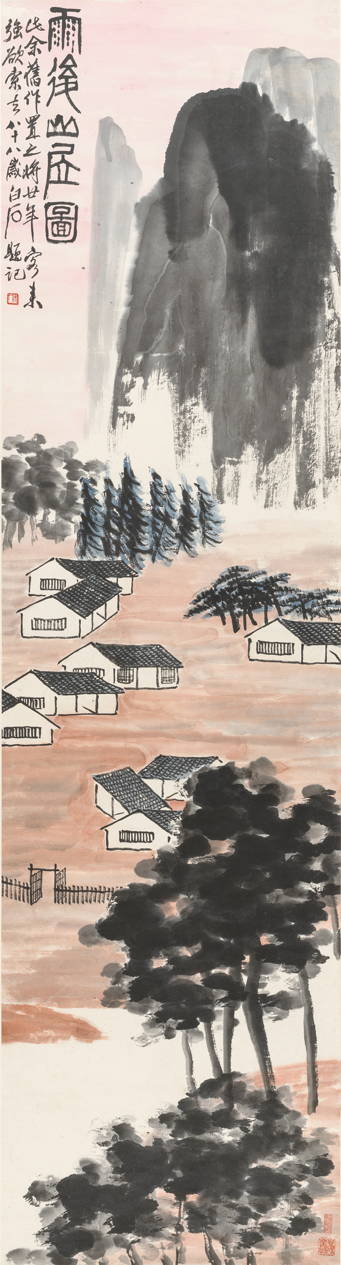 Lot 3130 齊白石(1864~1957),雨后山居圖,立軸 設色紙本,176×46 cm