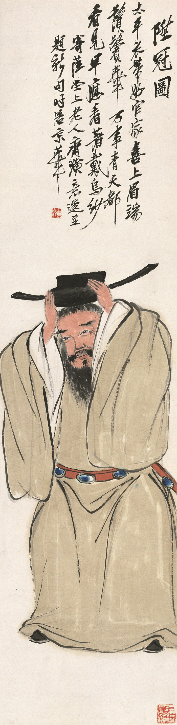中國有句吉祥話,叫作“升官發財”,即祝愿官位高升、財源廣進。齊白石出身農民,常畫老百姓所喜愛的吉祥題材。中國古代將帽子稱為“冠”,與“官”同音。畫中人將帽子舉起,表面上看是“升冠”,實際上是“升官”之意,以此祝愿他人步步高升,大展宏圖。