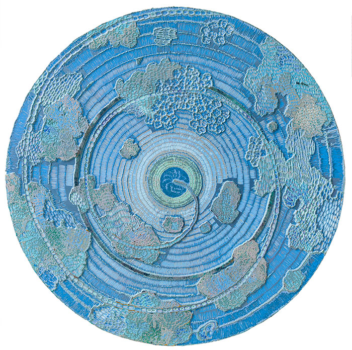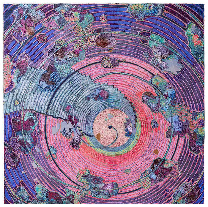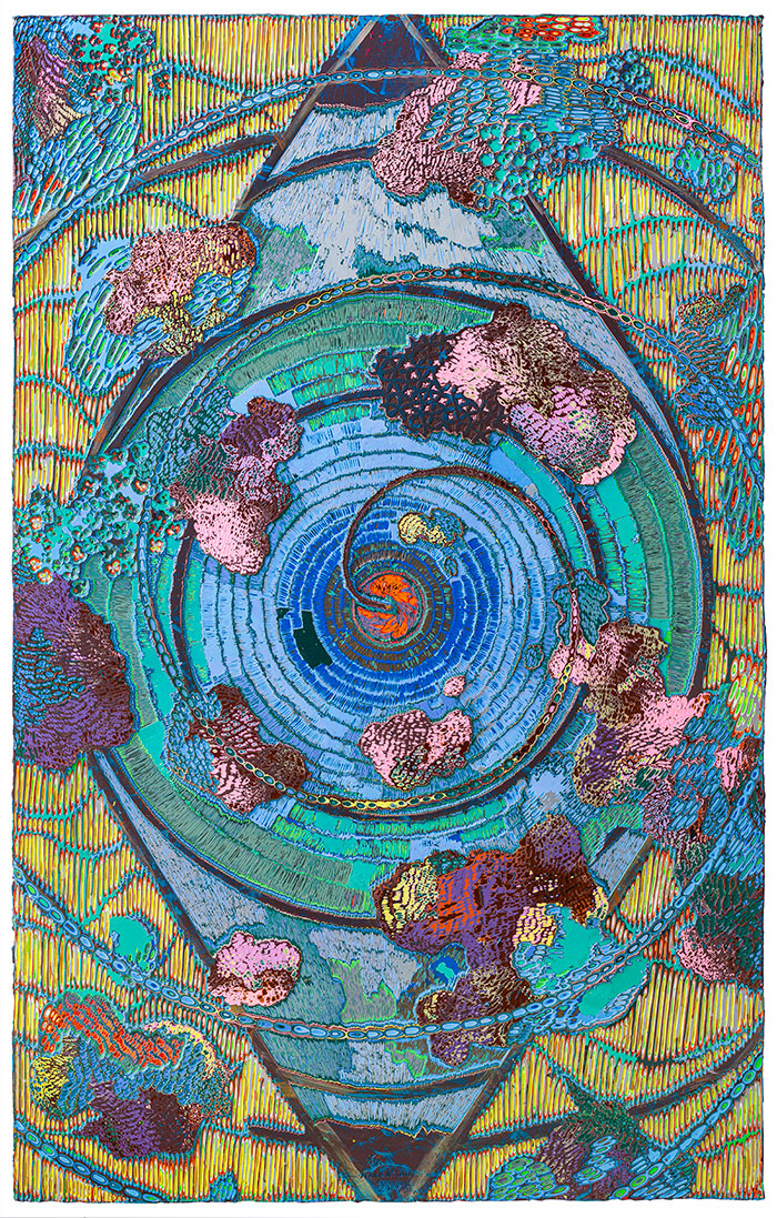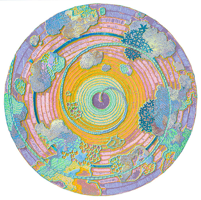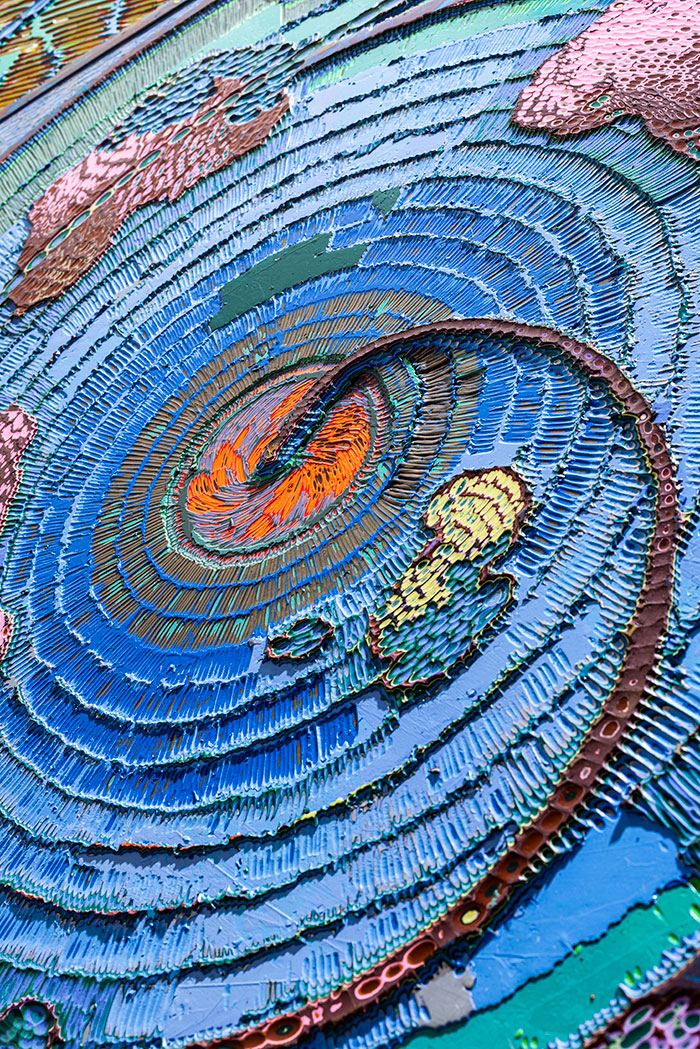 我們的采訪和談話從姜淼近期的刀刻丙烯作品開始。以螺旋、漩渦、莫比烏斯環等抽象符號構建起獨特的視覺語系,將“色彩”作為承載能量的物質媒介。那些經由刻刀雕琢出的色彩和肌理,在畫面上形成繁復微妙的起伏,每一筆刻刀剖開的筆觸都像一塊新生的大陸,既在宏觀上營造出和諧的秩序,又在微觀中暗藏無數細節,仰觀俯察,以小現大,吸引人陷入一場沉浸式的視覺冥想。