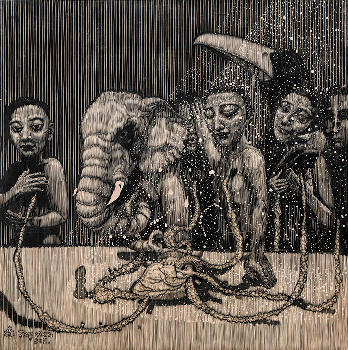 Q:黑白木刻時期,您也畫過一段時間的人物油畫,如《中國式飯局》,此后人物好像就從您的作品中消失了,這樣的轉變源于什么?