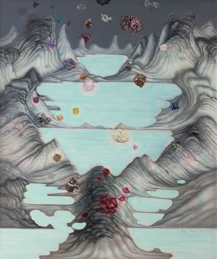 姜淼:我的畫面里只有兩種石頭,一種是來自太空的隕石,一種是地球孕育的寶礦石?!百p石”本身是東方審美語境下的行為,人們欣賞石頭的自然形態,石頭也承載了人對生命和精神永恒性的投射。