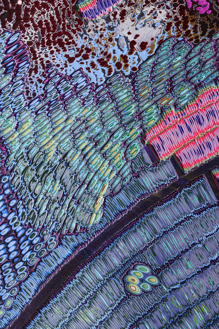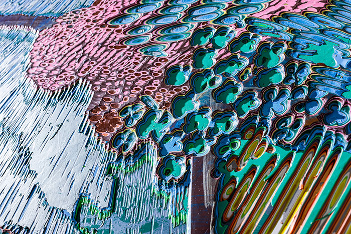 走進藝術家姜淼的工作室,高大明亮的空間里從墻壁到地面,都鋪滿了作品。色彩斑斕的丙烯顏料在木板表面斷層般層層堆疊,地面斑駁的顏料痕跡上,十幾把刻刀錯落排列,空氣里彌漫著顏料未干時揮發的氣息,無聲地訴說著姜淼每天高飽和的工作狀態。
