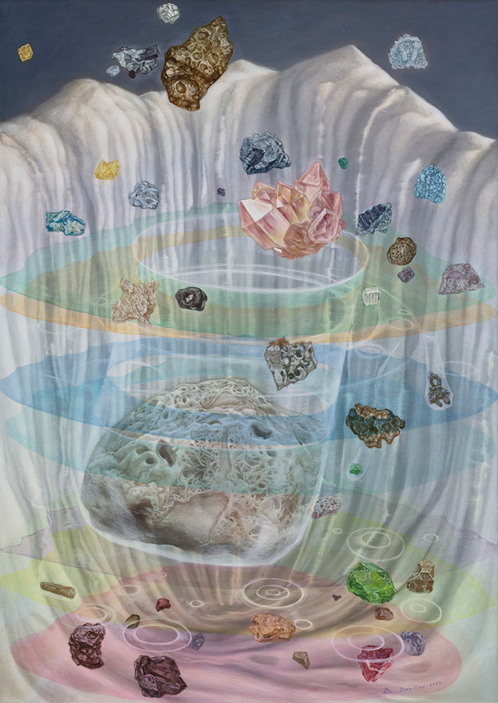 在我的畫面里,石頭象征人的生命,它們在山水宇宙間育化,每塊石頭都綻放著各自與眾不同的光彩和頑強的生命能量。畫面中的場景是我曾在夢里去到的一個地方,那里的風景,水的溫度、濕度,空氣附著在身上,包裹我,有點像回歸母體那種溫暖又安全,極其靜謐的感受。畫面里的山、水都是沒有邊界的,我們就是被這樣一片無限廣袤的空間包裹著,是人生命的家園和補給,也是天、地、人得以融合的一個大關系。