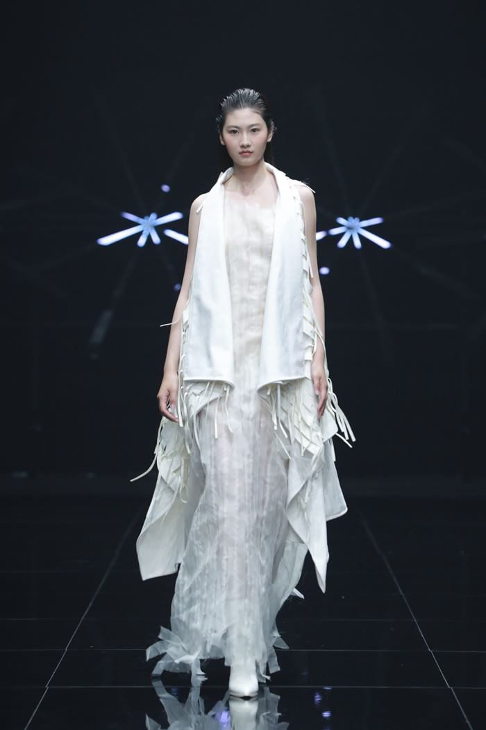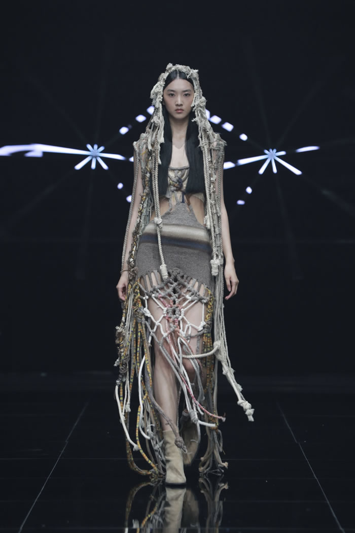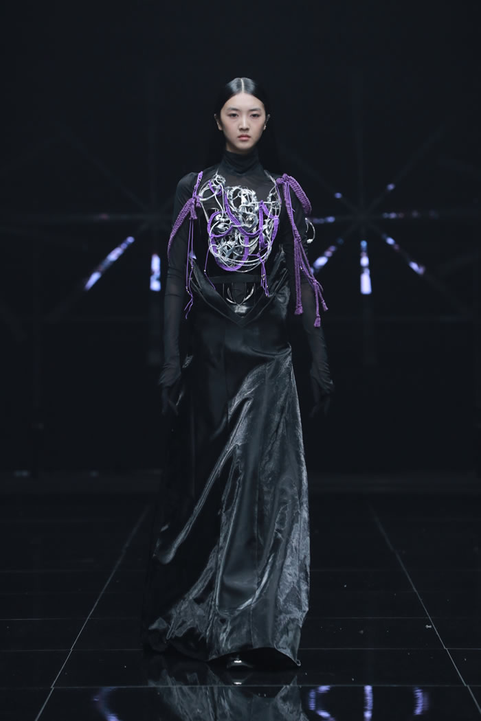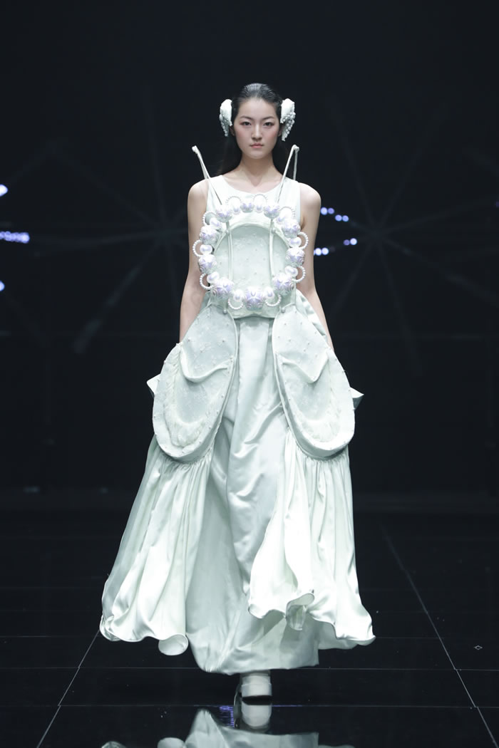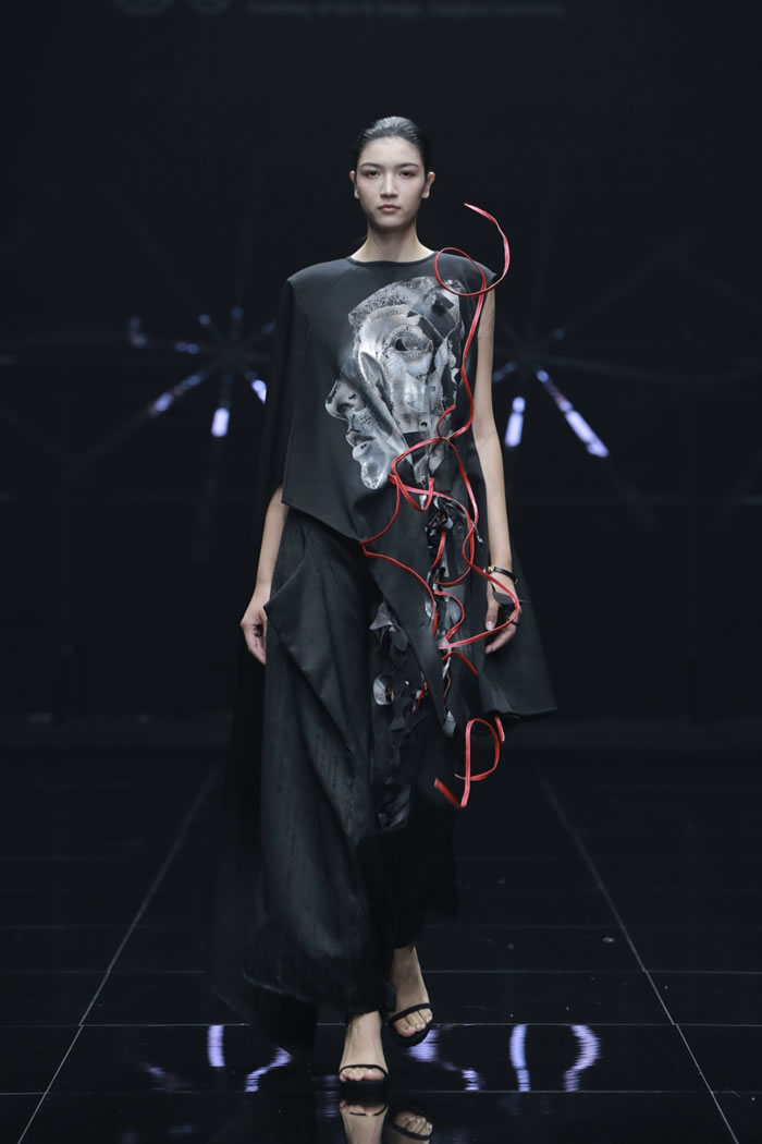 在“重疊”的主題之下,同學們在材料選擇與造型語言上大膽嘗試,嘗試建構一個融合傳統與未來、現實與幻想、身體與精神的多維時尚世界。通過對文化、技術、生態與身份等議題的深入回應,彰顯了新一代設計師以衣為媒,跨越邊界、重構敘事的創作理念。一件件作品在舞臺中交相輝映,給觀眾呈現一場精彩的視覺盛宴。