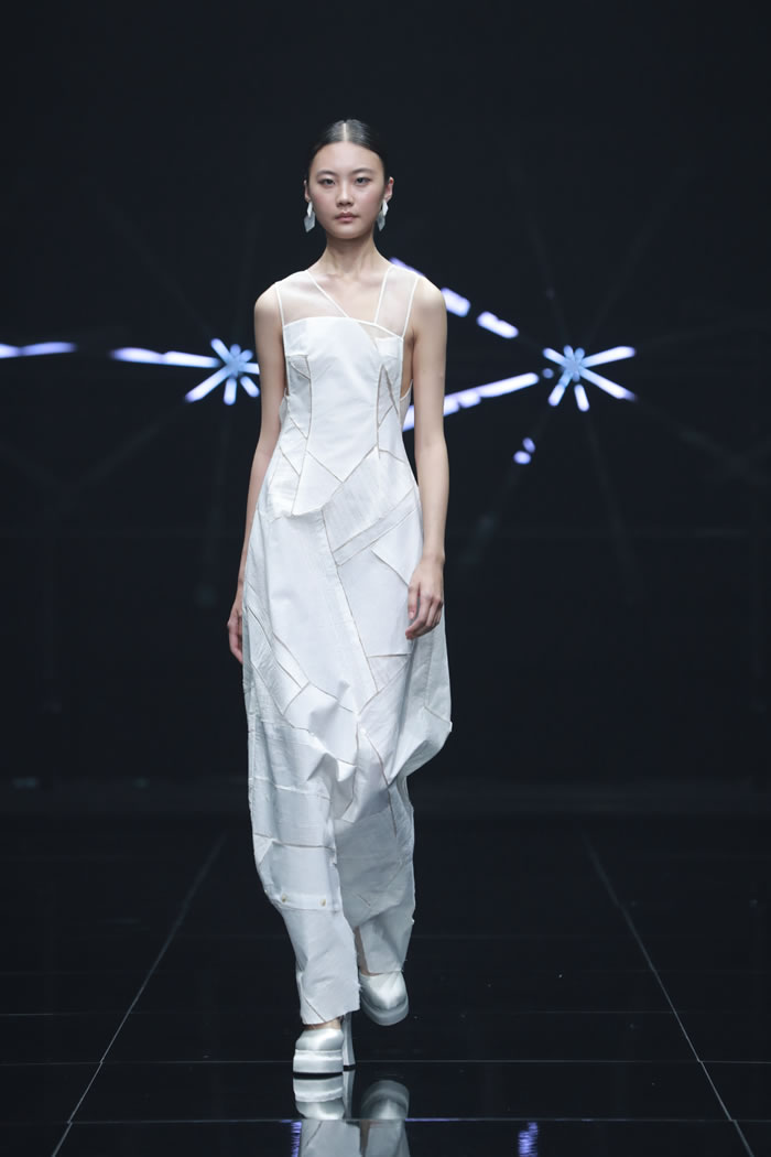 同時,還有一類作品圍繞個體情緒、身份認同與社會議題創作而成?!蹲杂繁磉_在“績效過勞”中尋求自我療愈的細膩狀態;《半夜下雪沒人知道》用幻變的光影象征靜默之中的情緒堆積;《觀》以白色調與零浪費裁剪來映射內心想法;《回聲》批判性呈現社交媒體時代下個體身份的異化與模糊;《浮光織影》融合緙絲技藝與正負形裁剪,打造兼具傳統與現代的商務著裝方案。
