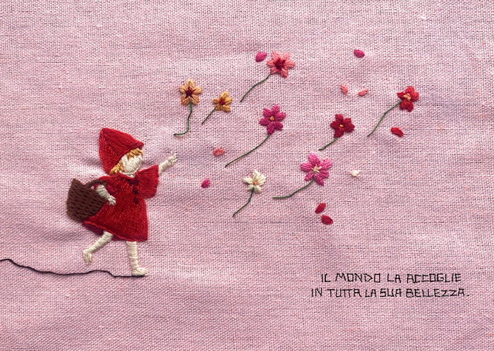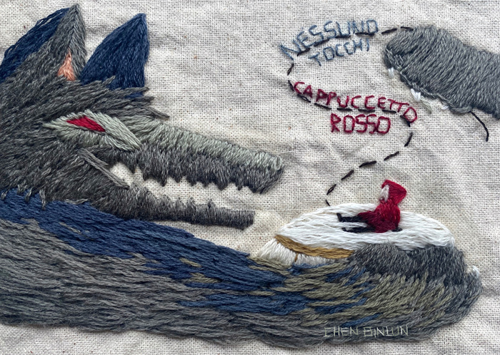 陳玢綸的作品不僅延續了中國傳統刺繡技法的工藝,還在此基礎上融入了現代的敘事手法?!恫灰|碰小紅帽》系列作品通過刺繡方式重新演繹了經典童話《小紅帽》,并融入了女性暴力的主題。作為一本Sedicesimo(“十六頁小書”)插畫集,這些作品通過針線勾畫出一個充滿力量和抵抗的“新小紅帽”,挑戰了傳統童話中的女性脆弱形象,展現了女性自我意識覺醒與反抗。