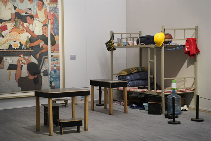 尤為值得一提的是,本次展覽在呈現方式上進行了大膽創新,將架上繪畫、工地裝置與實物道具三者巧妙融合。這種獨特的布展方式,不僅延續了勞動敘事固有的人文溫度,更借助腳手架、彩鋼板、水泥地面等鮮明的工地元素,對傳統的觀展邏輯進行了重構。同時,高低床、手工桌椅等充滿生活氣息的實物道具的置入,也極大地延展了作品的敘事語境,旨在探索并打造一種“主流價值敘事與創新藝術表達”深度融合的全新范式。