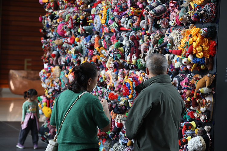 策展人廖雯在前言中寫道:“這個展覽命名為‘界’,是因為從藝術家的所屬年代、教育背景到表現手法,都跨越了我們通常認知的邊界?!?0歲的趙玉中從未受過專業訓練,卻以廢棄物品通過拼貼等方式創作出《魔園》這件充滿想象力的裝置;學院出身的藝術家向京的在其雕塑《追魚》中將神話意象與現代元素并置;青年藝術家朱離子格則用鋼絲球這一日常物料,通過拉伸編織出了《筆觸》這件可互動的現場裝置,并與她展出的紙本繪畫形成聯動。策展人特別強調了三代藝術家在創作方式上的差異:趙玉中完全依靠自學,向京接受過嚴格的學院訓練,而朱離子格則走出一條介于兩者之間的道路。