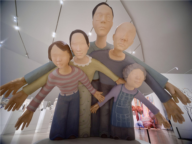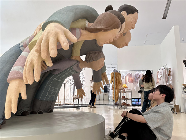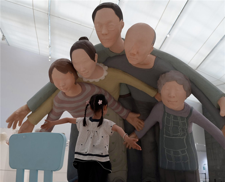 “最初,作品并非具體的人物形象,我想要隱晦地表達。我曾想過用一些代表成人的物品,如領帶、西裝等往下壓,營造壓迫感,但后來在與導師們的交流中,尤其是我的導師張偉老師指出,如果在石窟藝術中這種形式可能成立,但在一個沒有背面支撐的場域里則不成立。于是,我決定直接以家庭的概念,用幾個人物來表達?!?br style="-webkit-tap-highlight-color: rgba(0, 0, 0, 0);"/>