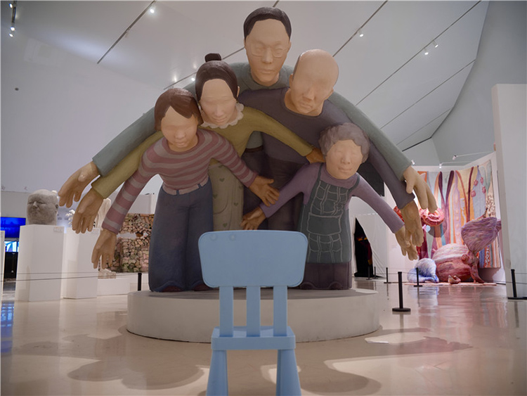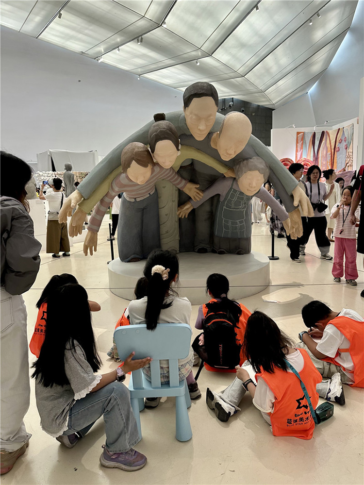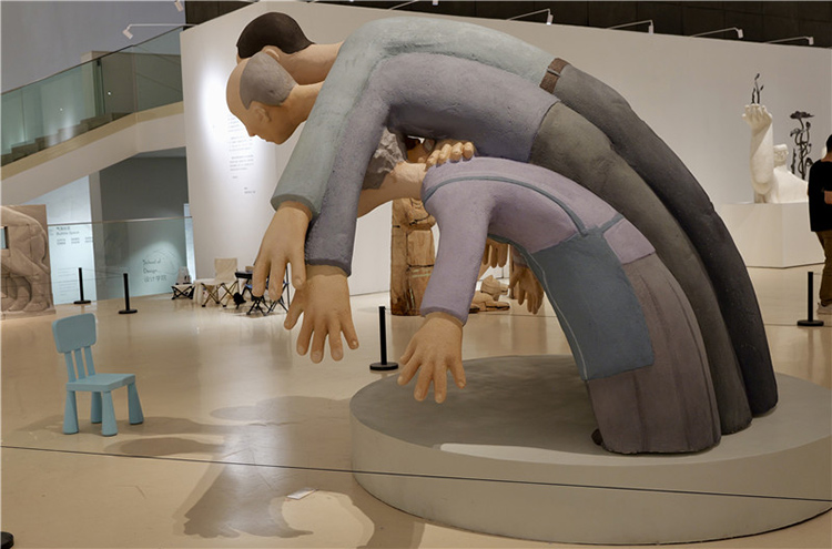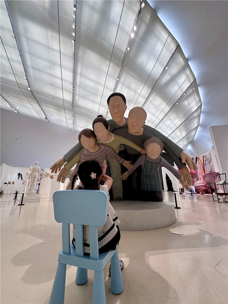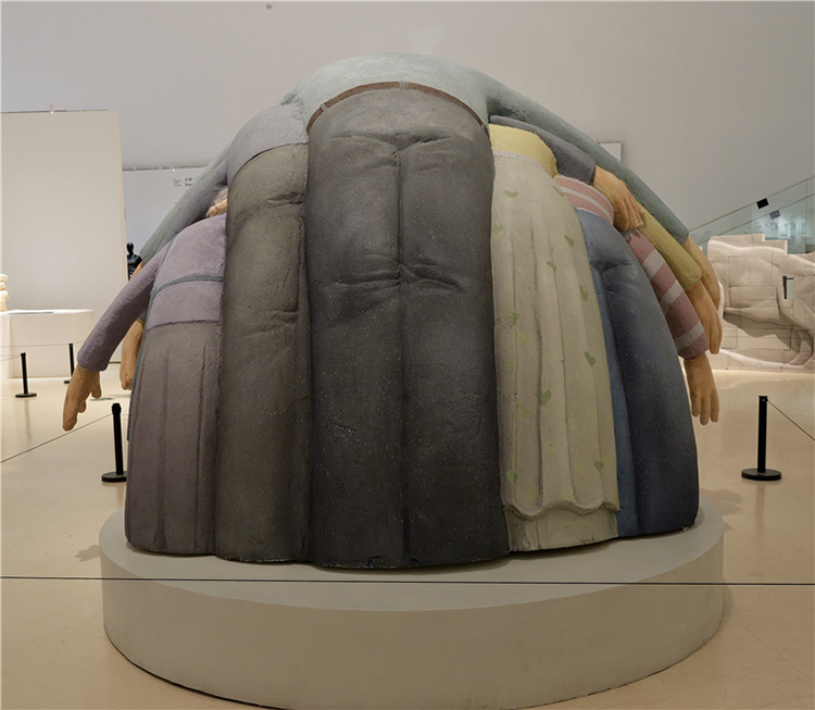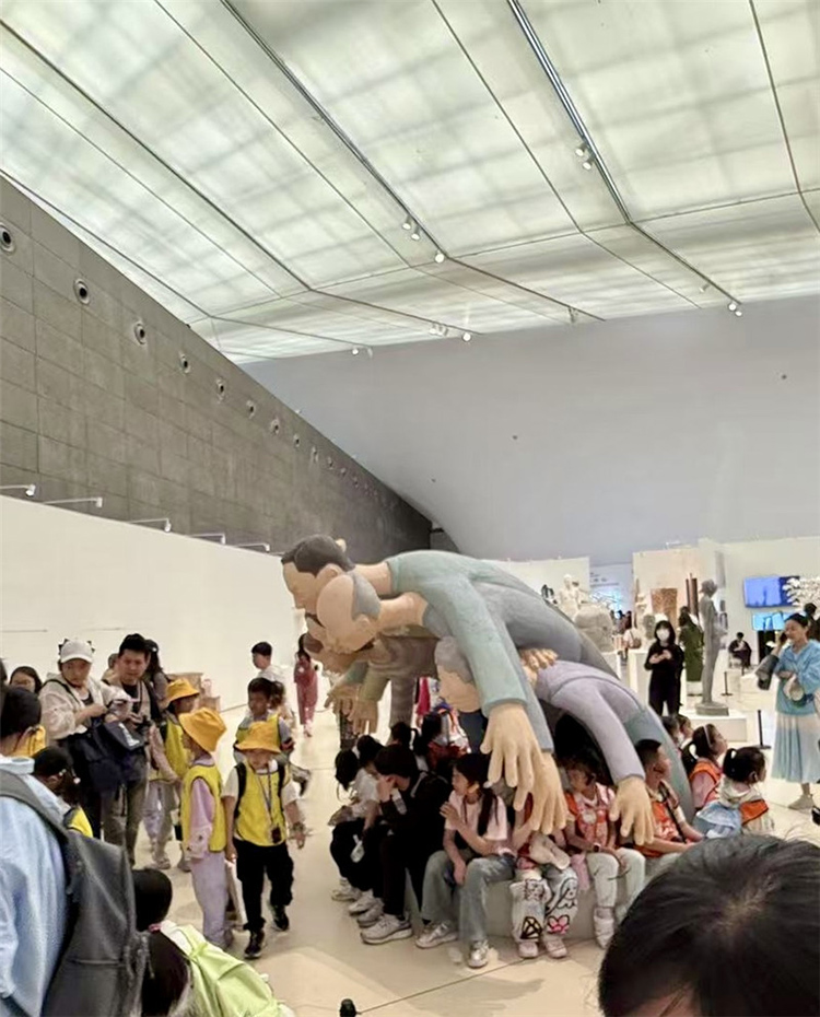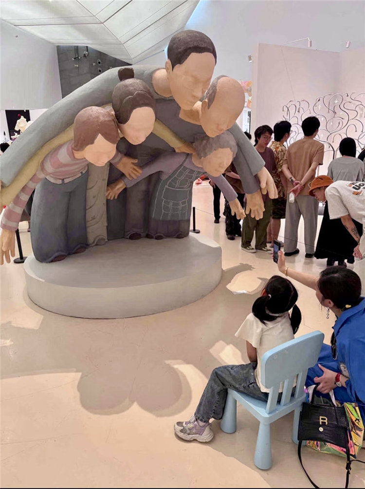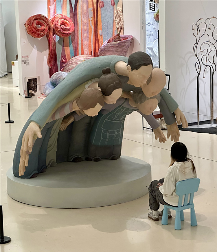 這件作品通過雕塑主體部分人物形象的手臂和身體相互重疊,形成了一種包圍的效果,前方放置了現場品:一把藍色的小椅子,觀眾可以坐在上面進行互動體驗,整個作品給人一種強烈的視覺沖擊和壓迫感。作品中的人物形象代表了家長,他們以一種幾乎要將中心人物(代表孩子)包圍的姿態出現,象征著家長對孩子的期望和關愛。然而,這種關愛的強度和方式卻讓孩子感受到了巨大的壓力,正如雕塑中人物形象的壓迫感所表達的那樣。雕塑中的藍色小椅子則為觀眾提供了一個觀察和體驗作品的視角,它不僅是一個物理上的觀看點,也象征著孩子在家庭關系中的立場。當觀眾坐在椅子上時,他們可以更直觀地感受到被包圍和壓迫的感覺,從而更深刻地理解作品所探討的家長與孩子之間的復雜情感。