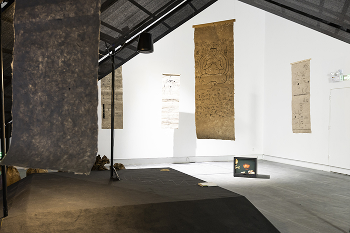 陳曉陽:從一開始我們邀請中國影視人類學領域的資深人類學家鮑江和張靜紅,也包括合作策展人熊迅,雖然他作為合作研究員參與過第一屆泛東南亞三年展的研究和討論,但是當他真正參與策展工作,才開始了解美術館工作過程中的具體方法和內容。他們首先不太清晰的是藝術家和策展人的工作內容和區別,此外,也不太清楚博物館展覽和美術館展覽的差異,以為需要將民族志研究中的很多信息都帶到展場,像博物館里的展陳那樣。 因此,在溝通過程中,我需要跟他們解釋藝術作品與民族志作品的差異,比如藝術作品有時不需要這么多文字性信息的說明,藝術創作大多數時候是去敘事的,通常會以一針見血的方式去表達,將一些關鍵性的瞬間、關鍵性的片段呈現出來就夠了,而不需要由頭到尾地講故事。就像鮑江老師最初時以為想把整個納西的山谷搭建出來,來體現他研究的東巴文化的生態和社會情境,我會跟他解釋不需要用做模型的方式再現,而可以用象征和抽象的方式來表達。當然,人類學家的文化理解力是極敏銳的,并且有著很強的聯系田野現場和材料的能力。當我提出將描述東巴宇宙觀和儀式的圖用手繪方式轉化到紙上,像畫一樣懸掛在展廳中作為作品的一部分時,他立刻提出可以跟當地的東巴朋友為此次展覽定制專用的抄寫東巴經的手工紙,并且從當地借來馬幫皮袋和當地的谷物時,我明白他已經迅速理解了展覽敘事的一些方法。