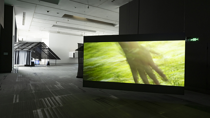 如邱垂珍(Jenny Chio)的三段影像作品,同樣選擇田野影像片段進行表達,其實也有藝術家拍這種影像,但她記錄的是三個田野伙伴——外出打工的三個苗族女性的歸鄉途中各自的視角,而不是外在的藝術家視角。邱垂珍從她田野伙伴經由水路或公路的回家路途視角,來呈現她們家鄉的變化,包括鄉村的建設,傳統文化、鄉村振興,城市化的影響等等。這并不是她完整的人類學電影,只是在做田野的時候順便記錄拍攝的田野素材。我們促成了秦晉和Jenny的對話,秦晉和我也給了她一些建議,在多次溝通后,她覺得這次不需要放完整影片進展覽中來,這些片段可能更容易達成對話。Jenny在對話中理解了展覽敘事的差異和形式特征,迅速借鑒了藝術家的方法。但是你會感到這件作品即使模仿了當代藝術的展陳,但討論的問題的角度和問題意識還是有很大差異性的。她還詢問是否可以把她的田野筆記展示出來?這些筆記是她做田野的時候,記錄自己心情的一些變化。我說將幾張紙片直接放在那里是失效的,建議她把文字印在簾子上形成圖像感,也會有一種柔軟的感覺,可以讓這件作品的呈現更豐富,因為織物材料本身就有它的語言。